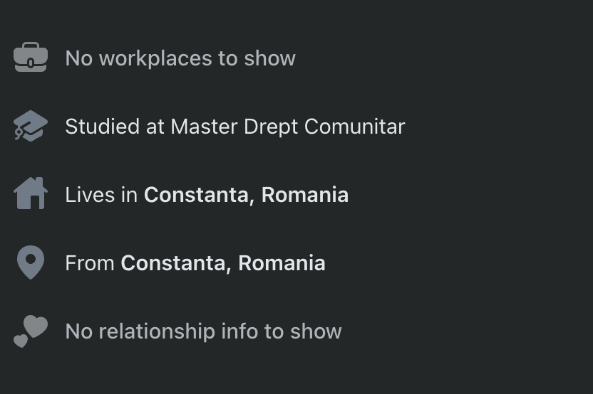 Informațiile cu privire la studii publicate în secțiunea „about” a contului de Facebook sunt identice cu cele publicate pe blogul CronicuTZa lu Sylver.