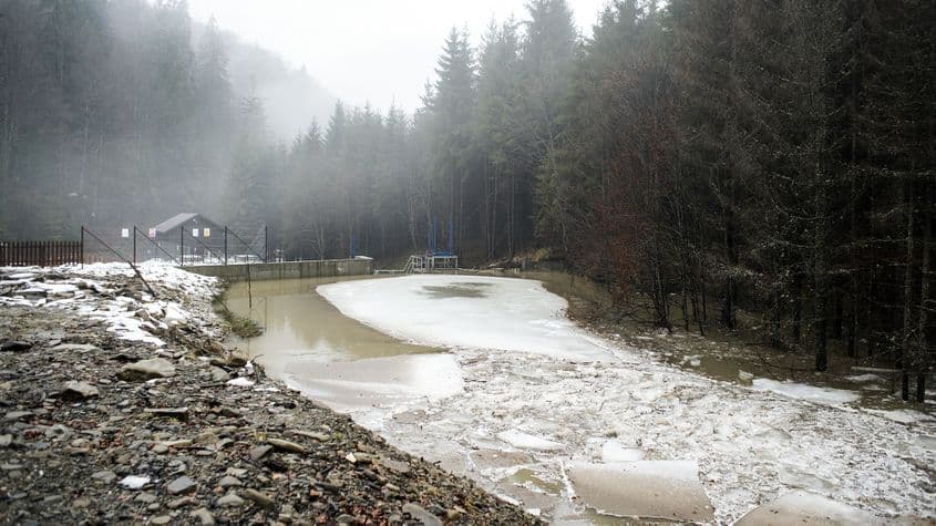 Pe măsură ce înaintăm în amonte pe Lăpuș, apa se subțiază și prinde crustă de gheață. Dimineață, de la ISU Maramureș ni s-a spus că da, e avertizare de Cod Galben, dar deocamdată nu există intervenții.