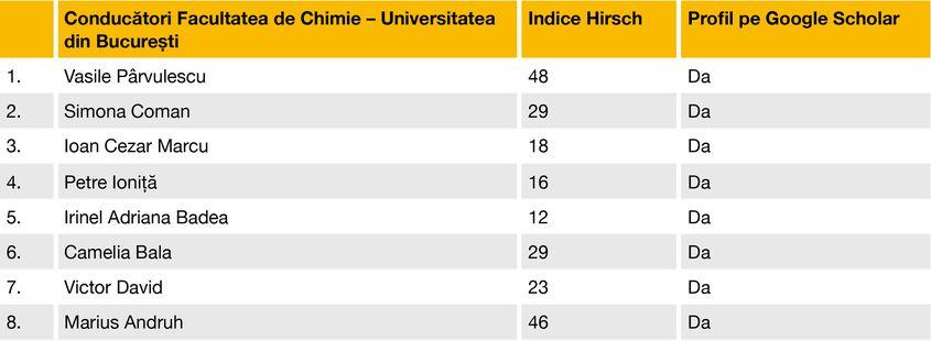 Conducătorii de doctorat de la Facultatea de Chimie a Universității din București au indici uriași în comparație cu cei întâlniți la Științe Militare, Informații și Ordine Publică.