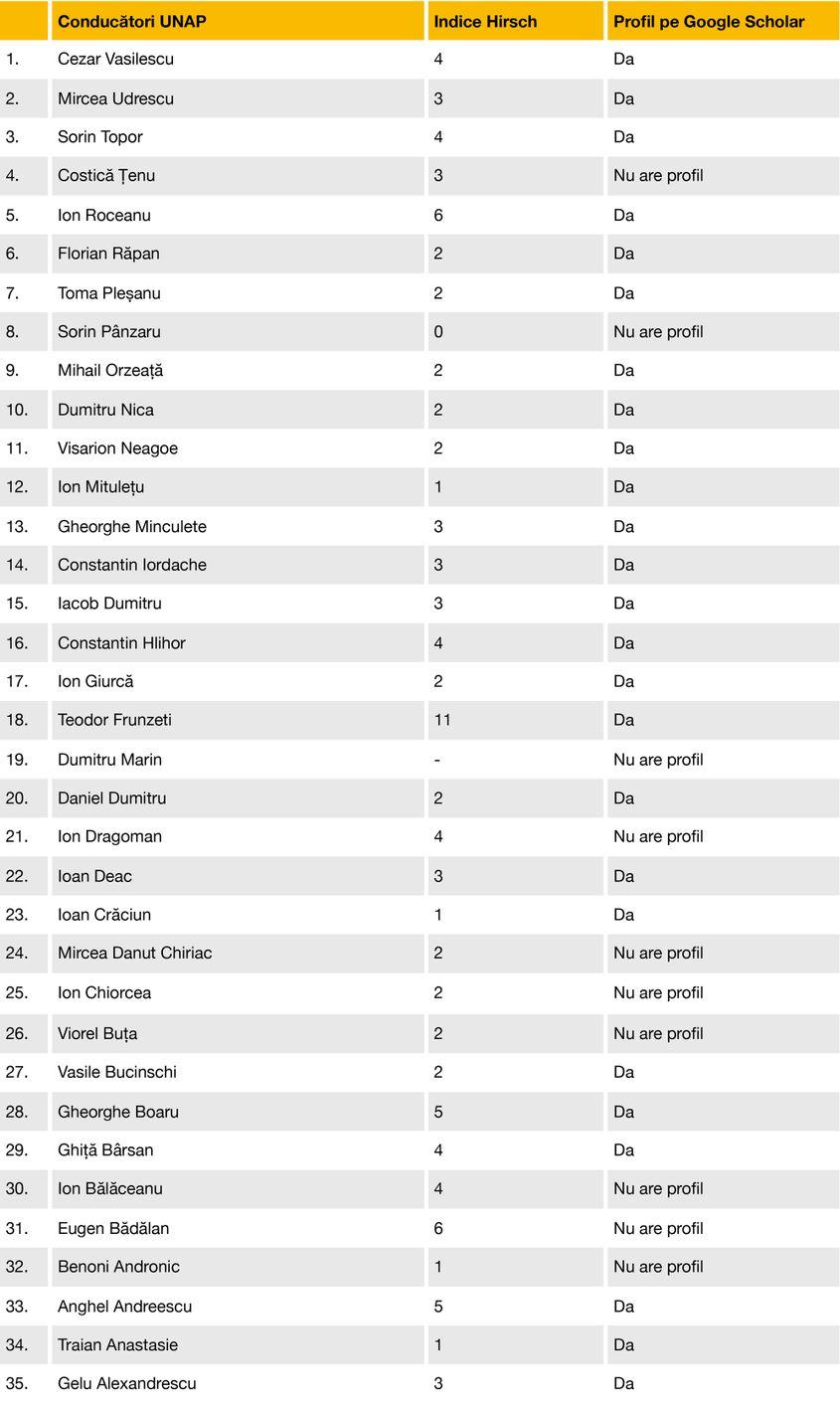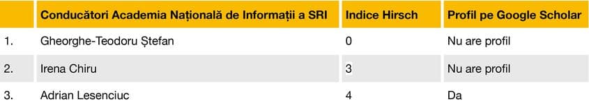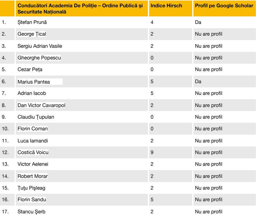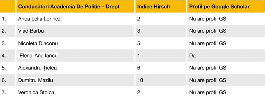 Patru conducători de doctorate de la Școala doctorală în Ordine Publică și Siguranță Națională a Academiei de Poliție au indice Hirsch zero, ceea ce înseamnă că nu au scris niciun articol sau studiu relevant.