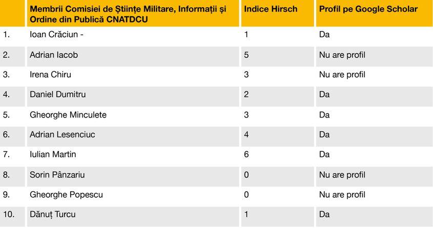 Membrii Comisiei de Științe Militare, Informații și Ordine Publică, cu două excepții, au un indice Hirsch irelevant.