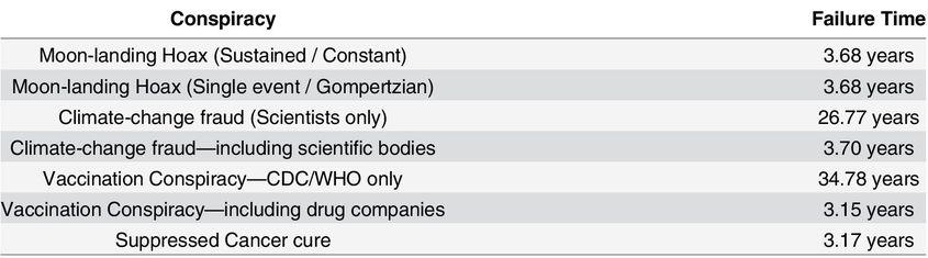 La final, Grimes introduce în acest template parametrii specifici ai unei conspirații și „îi iese” că, indiferent cum ar fi stat lucrurile, conspirația aselenizării ar fi fost demontată după maximum 5-6 ani. Conspirația medicației pentru cancer ar fi cedat și ea după același interval de timp.