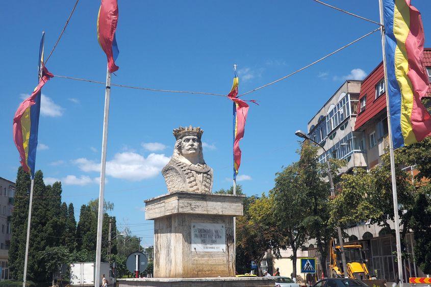 În centru, un bust de domnitor, o biserică în reparaţii capitale şi o primărie închisă.
