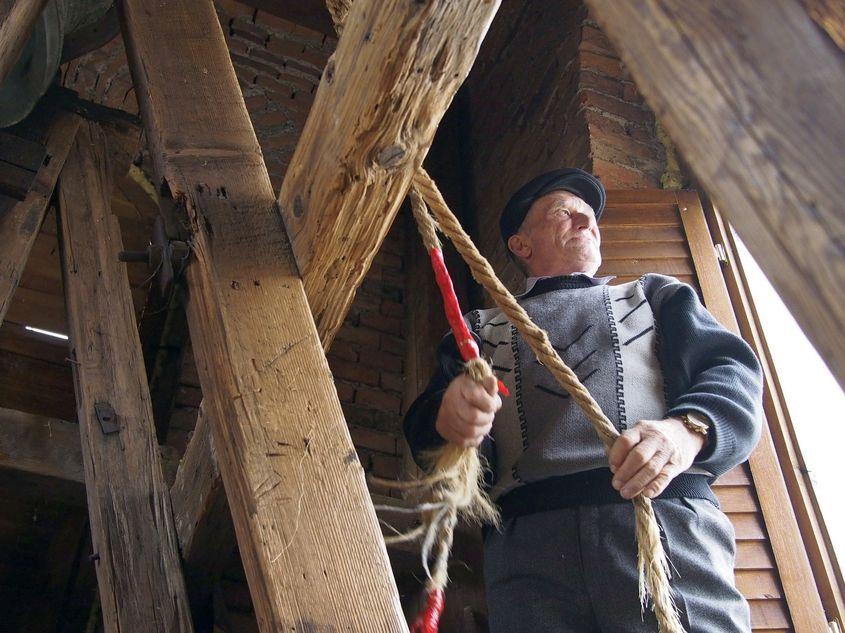 „Sunt 64 de trepte pe care le tot urc și le cobor, mă păstrez în formă. Clopotele astea două sunt vechi, dar cel mai interesant lucru e că fiecare bate spre sat o dată, iar cătră Ocna, limba lovește în clopot de două ori, nu pricep cum. Tragi de funii alternativ, uite-așa. Hai, trage și tu, nu tare, nu trebuie forță, numa’ ritm. Tragem o tură, apoi facem 5 minute pauză și iară, tot așa, de trei ori cu totul. Și aici sunt niște reguli clare. No, hai jos. Io, mai târziu, urc iară.”