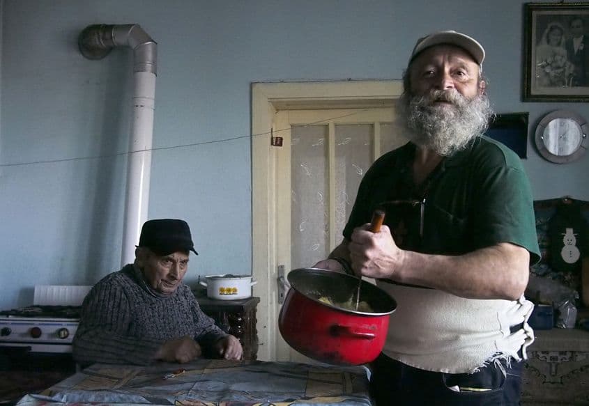 Are două pisici superbe și un câine atât de bătrân, încât latră direct din cutia în care doarme, sub o masă. În bucătăria lor caldă și primitoare, doamna Veronica mă îmbie cu cafea și prăjitură. Zic săru’mâna.