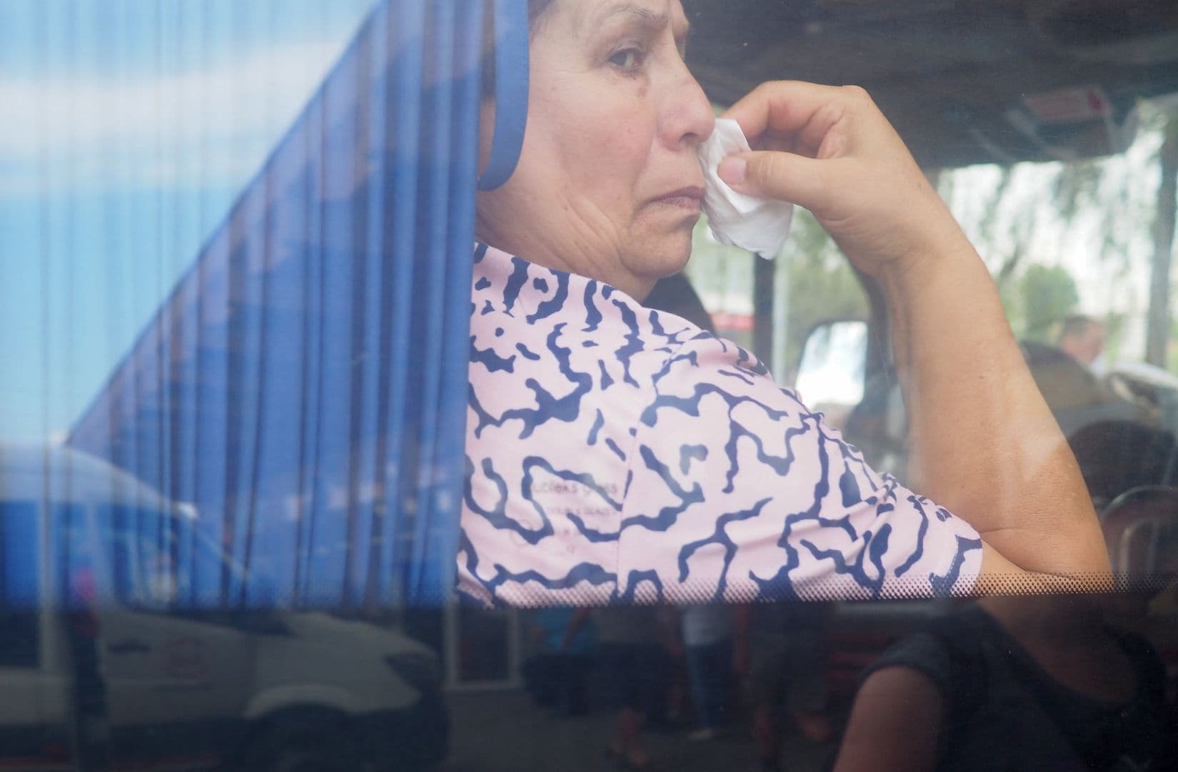 În rama ferestrei unui autobuz ce pleacă aiurea, o femeie își șterge rapid o lacrimă. E sigură că n-o vede nimeni.