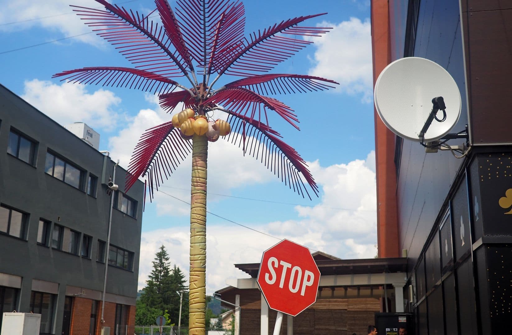 Din vitrine, manechine cu poșete se uită la noi în gol, cu figuri deznădăjduite. Semne strâmbe de circulație se conversează cu antene de satelit, vegheate de un palmier din plastic lung de 3 metri.