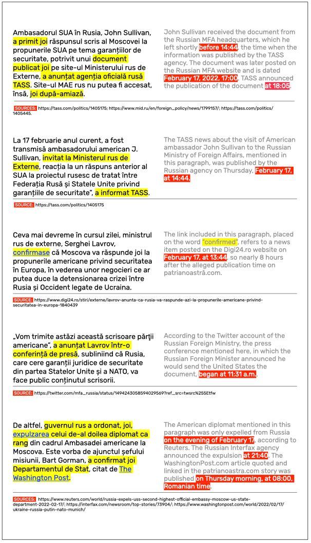 - However, this hypothesis does not explain why no other site linked back to patrianoastra.com, the alleged ‘source zero.’ For context: the site that we consider to be ‘source zero,’ realidateadinmoldova.md, published the screenshot on February 17, at 14:51, and was quoted and linked back to by at least 74 other sites within four hours.