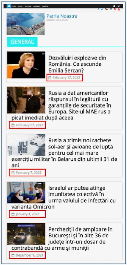 My first finding: in the GENERAL section there were two stories dated February 17: one with the ‘explosive revelations’ on Emilia Șercan (which included the screenshot), and another one, titled "Russia gave America the answer about security guarantees in Europe. The Russian MFA website went down immediately afterwards”. Previously, since the beginning of 2022, patrianoastra.com had only posted two other stories, both on matters of external affairs: one on February 7 and another on January 3.