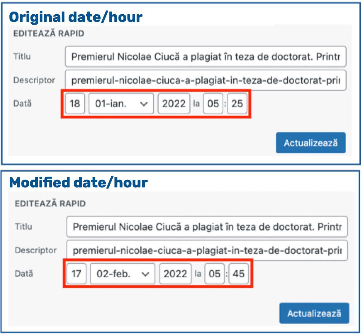 For instance, here is how the publication date of the article on Prime Minister Nicolae Ciucă’s plagiarism can be changed from January 18, 2022, at 05:25 in the morning, to February 17, 2022, at 05:45 in the morning:
