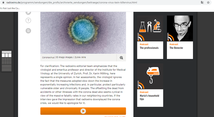 De fapt, și Sputnik, la rândul său, transcrie, copiază și montează declarațiile profesorului citat dintr-un interviu audio publicat de o stație de radio cu emisie în Berlin și regiunea Brandenburg, Radioeins, în 14 martie. Deci aproape cu trei săptămâni înainte ca ea să fie preluată de televiziunea din România.
