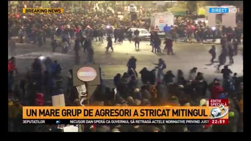 Pe burtieră, producătorii Antenei 3 au titrat corect: „Un mare grup de agresori a stricat mitingul”.