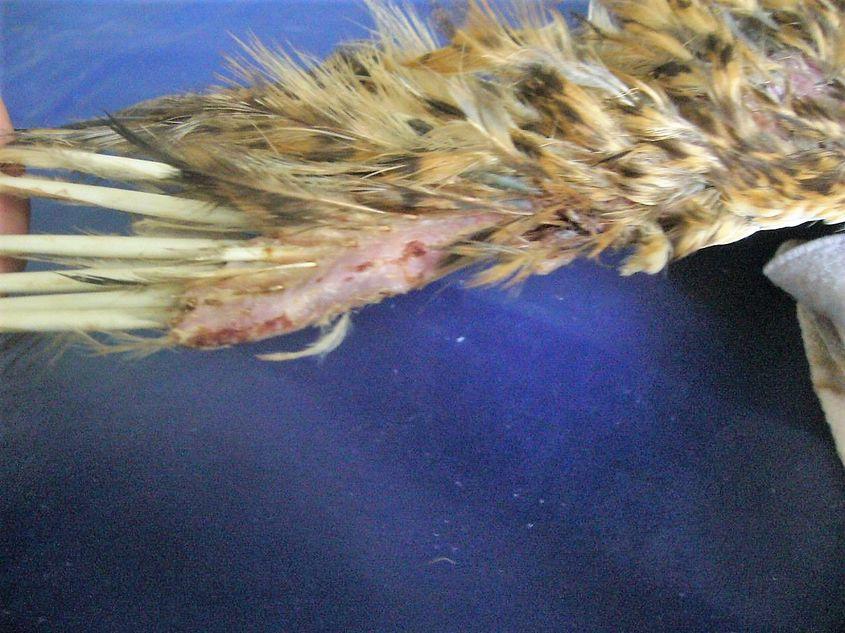 „În imagine este un ciuf de pădure. Ținut în captivitate într-un spațiu necorespunzător, prezintă distrugere parțială sau totală a penelor, leziuni cutanate și deplumare.” (Ciprian Petrescu – medic veterinar)