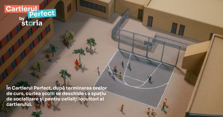 Practic, macheta Cartierului Perfect include beneficii pentru copii și adolescenți care devin avantaje pentru toți cei care locuiesc aici. Spre exemplu, curtea școlii, dotată cu terenuri de sport, arbori, spații de relaxare și umbră, devine o piațetă publică, deschisă tuturor, care leagă două străzi din cartier și funcționează ca loc de întâlnire pentru comunitate, după terminarea orelor de curs.