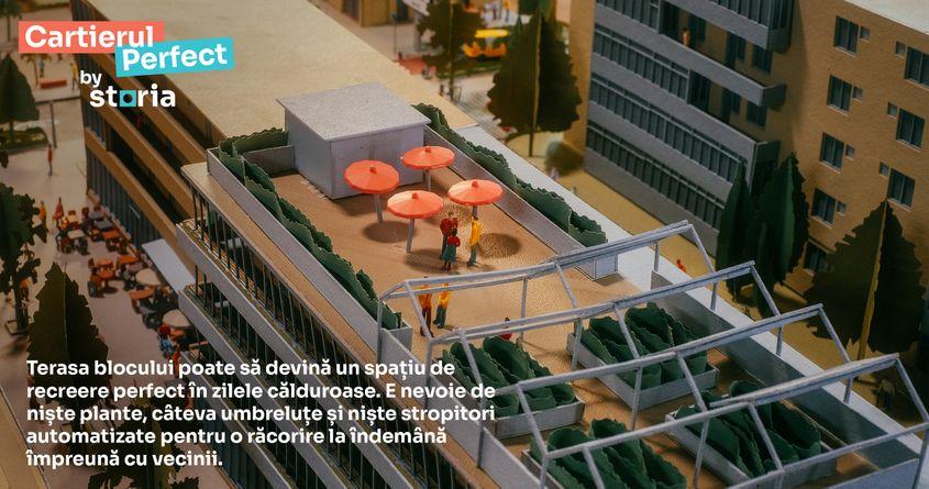 În Cartierul Perfect există o viață și pentru clădirile vechi - ce se întâmplă cu ele este o decizie luată împreună cu locuitorii cartierului, oameni din administrație și experți în arhitectură și urbanism. Și tot aici, terasa blocului, în loc să fie încuiată cu un lacăt de administrație, poate să devină un spațiu de recreere perfect în zilele călduroase. E nevoie de niște plante, câteva umbreluțe și niște stropitori automatizate pentru o răcorire la îndemână împreună cu vecinii.