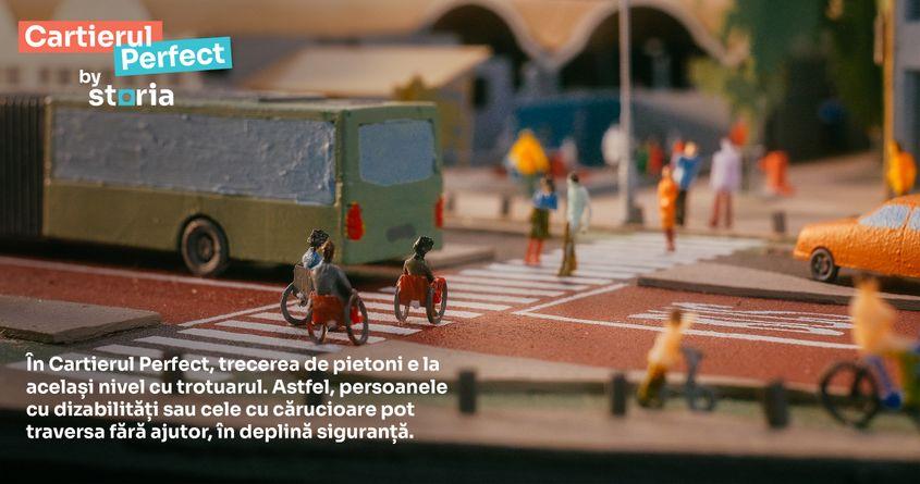În Cartierul Perfect fix asta se întâmplă - de la trotuare mai late și lipsite de borduri, pentru a facilita accesul persoanelor cu dizabilități, la benzi pentru biciclete și o bandă auto cu sens unic, cu viteză limitată la 30 km/h. Studiile arată că, la această viteză, pietonii au aproximativ 85% șanse de supraviețuire în caz de impact, în timp ce la 50 km/h probabilitatea unor consecințe fatale crește până la același procent.
