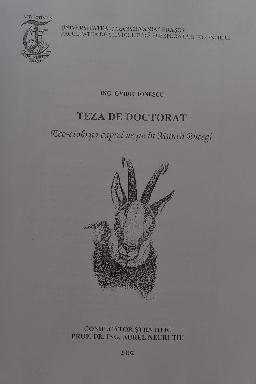Lucrarea de doctorat a lui Ovidiu Ionescu se intitulează „Eco-etologia caprei negre în Munții Bucegi” și a fost coordonată de profesorul Aurel Negruțiu (decedat în 2007).