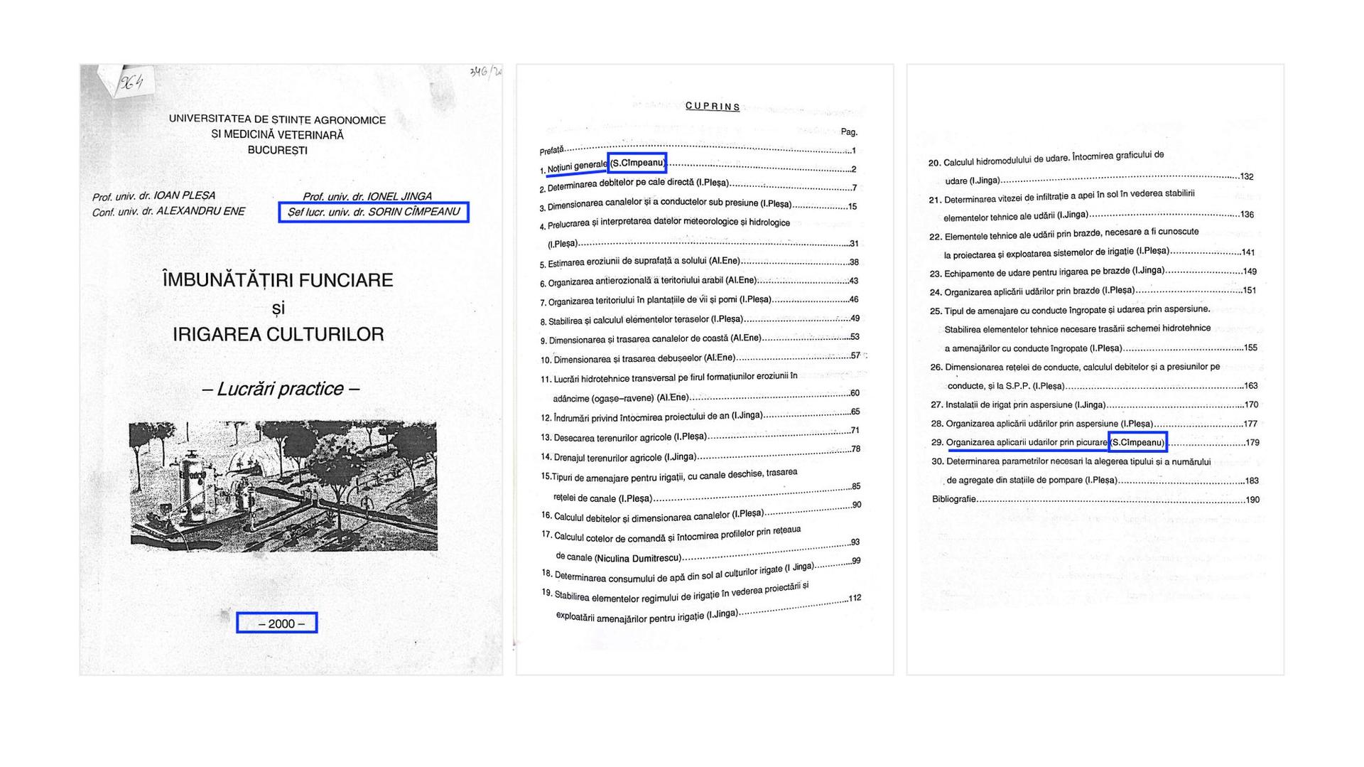 În acel an, 2000, numele șefului de lucrări Sorin Cîmpeanu apare ca fiind ultimul dintr-un grup de patru autori ai unui curs tipărit la USAMV-B: Îmbunătățiri funciare și irigarea culturilor. Lucrări practice.