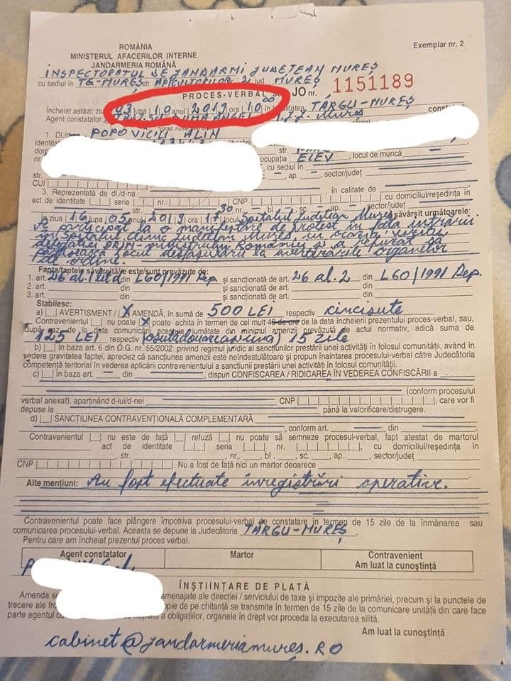 Din 16 mai, data la care ar fi săvârșit faptele, au trecut 141 de zile fără să se întâmple nimic. Dar, surpriză, pe 4 octombrie Alin a găsit în poștă procesul verbal de contravenție care justifica decizia Jandarmeriei de a-l amenda cu 500 de lei. Era chiar ziua în care a împlinit 18 ani. Alți 10 protestatari, printre care și tatăl tânărului, au fost amendați cu câte 1.000 de lei.