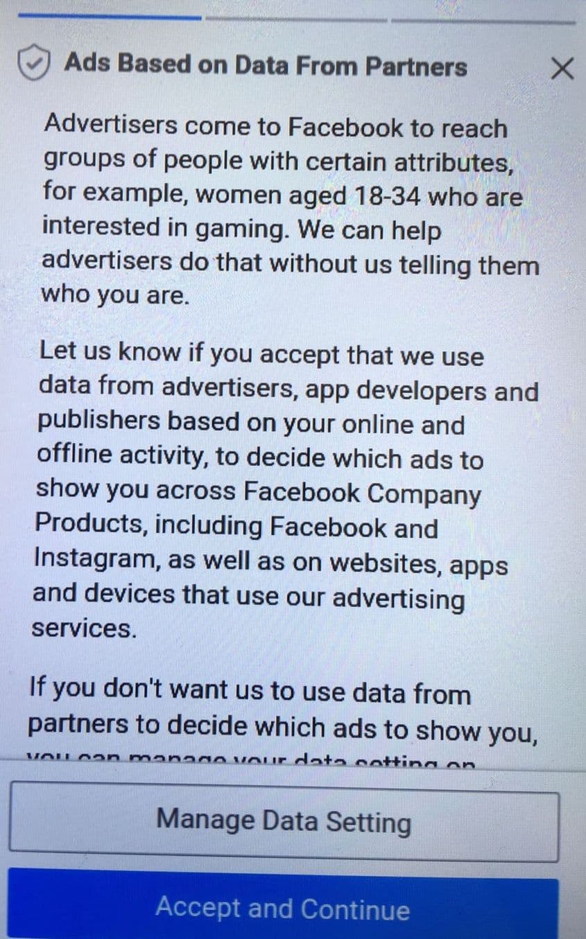 Intitulat „Reclame bazate pe date de la parteneri”, calupul de mai sus se traduce astfel: