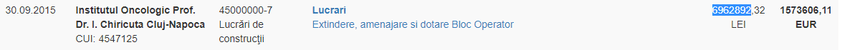 Pentru comparație, pe SEAP există un contract din 2015 pentru „extinderea, amenajarea și dotarea blocului operator” de la Institutul Oncologic din Cluj, câștigat de firma Tehnoplus Medical SRL. Valoarea contractului este de aproape 7 milioane de lei.