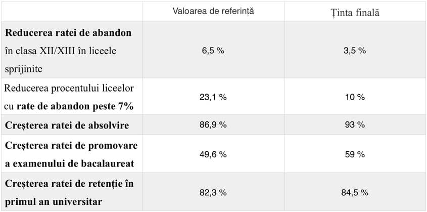 Reducerea ratei abandonului școlar la 10% și creșterea la cel puțin 40% a ponderii persoanelor cu studii superioare în categoria de vârstă 30-34 de ani sunt obiective din domeniul educației ale Strategiei Europa 2020, elaborată de Comisia Europeană pentru sprijinirea creșterii economice în UE.