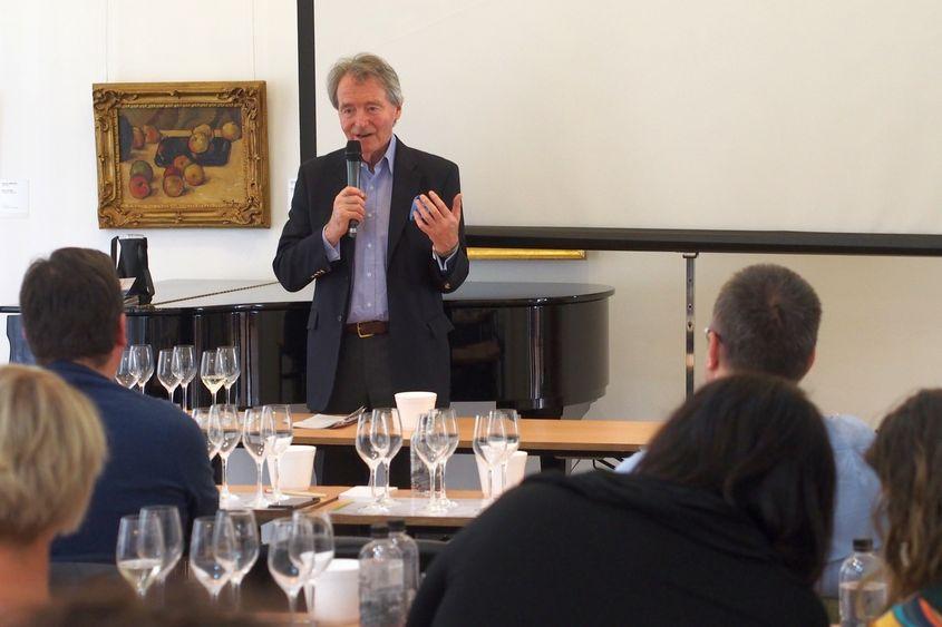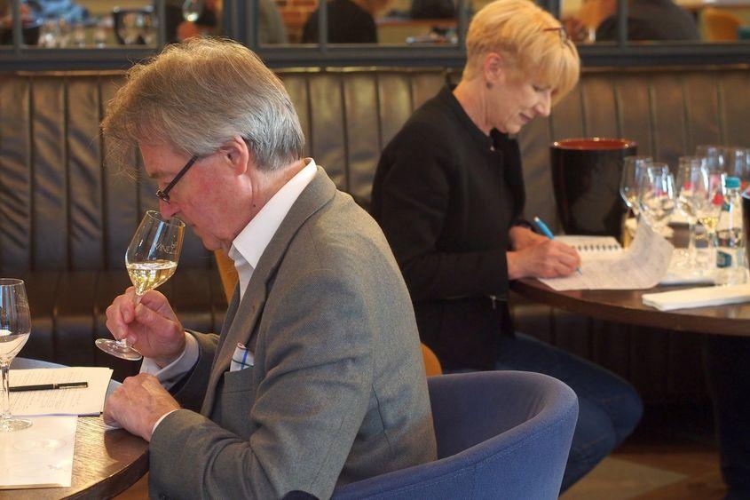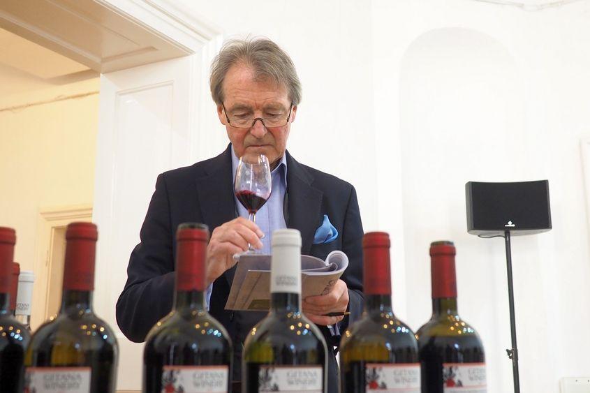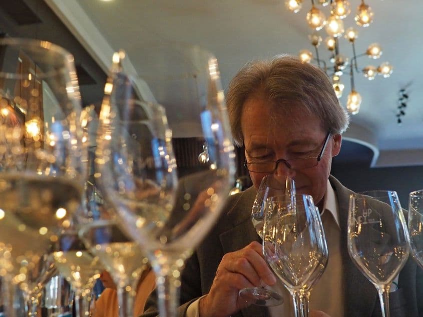 L-am urmărit la masterclass, degustând 9 vinuri cu totul necunoscute, repetând ore în șir aceleași gesturi pe care le făcuse la jurizare, cu o zi înainte: contemplă îndelung băutura în lumină, privește culoarea, învârte paharul ținându-l de picior, vâră adânc nasul în el și adulmecă cu ochii închiși.
