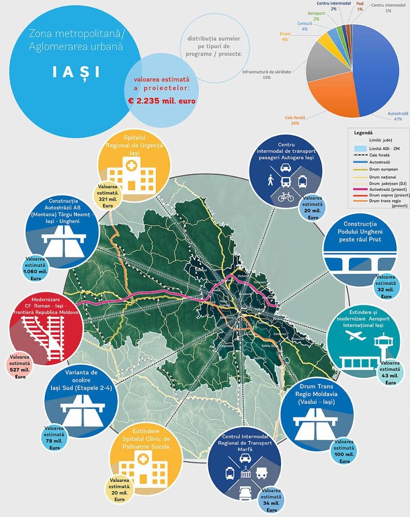 Zona metropolitană Iași are o valoare estimată a proiectelor de 2,23 miliarde euro, trei sferturi din această sumă fiind destinată căilor ferate și autostrăzii.
