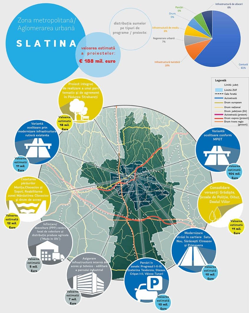 Proiectele majore din Slatina, reședința județului Olt, necesită una dintre cele mai mici sume din ţară pentru ca orașul să ajungă „la zi”. Ar fi vorba, la o primă estimare, de circa 188 de milioane de euro.