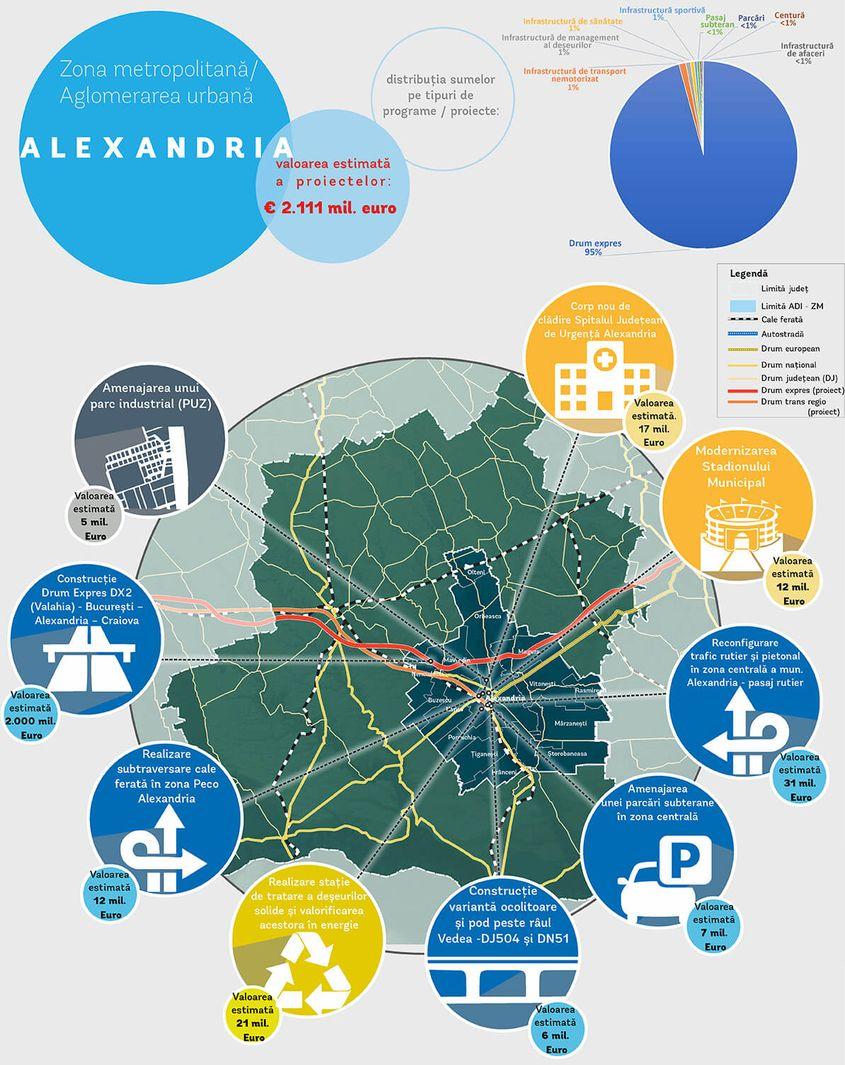 - reconfigurarea traficului rutier și pietonal în zona centrală a municipiului Alexandria – pasaj rutier,