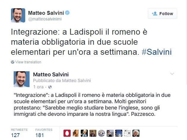 „În loc să învețe istoria, cultura și legile țării noastre”, a spus Fedriga, imigranții îi obligă pe copiii italieni „să învețe limbile și culturile celor care vin la noi”. În susținerea sa a intervenit și secretarul federal al partidului Lega Nord, europarlamentarul Matteo Salvini, care s-a exprimat pe Twitter cu privire la situația din Ladispoli: