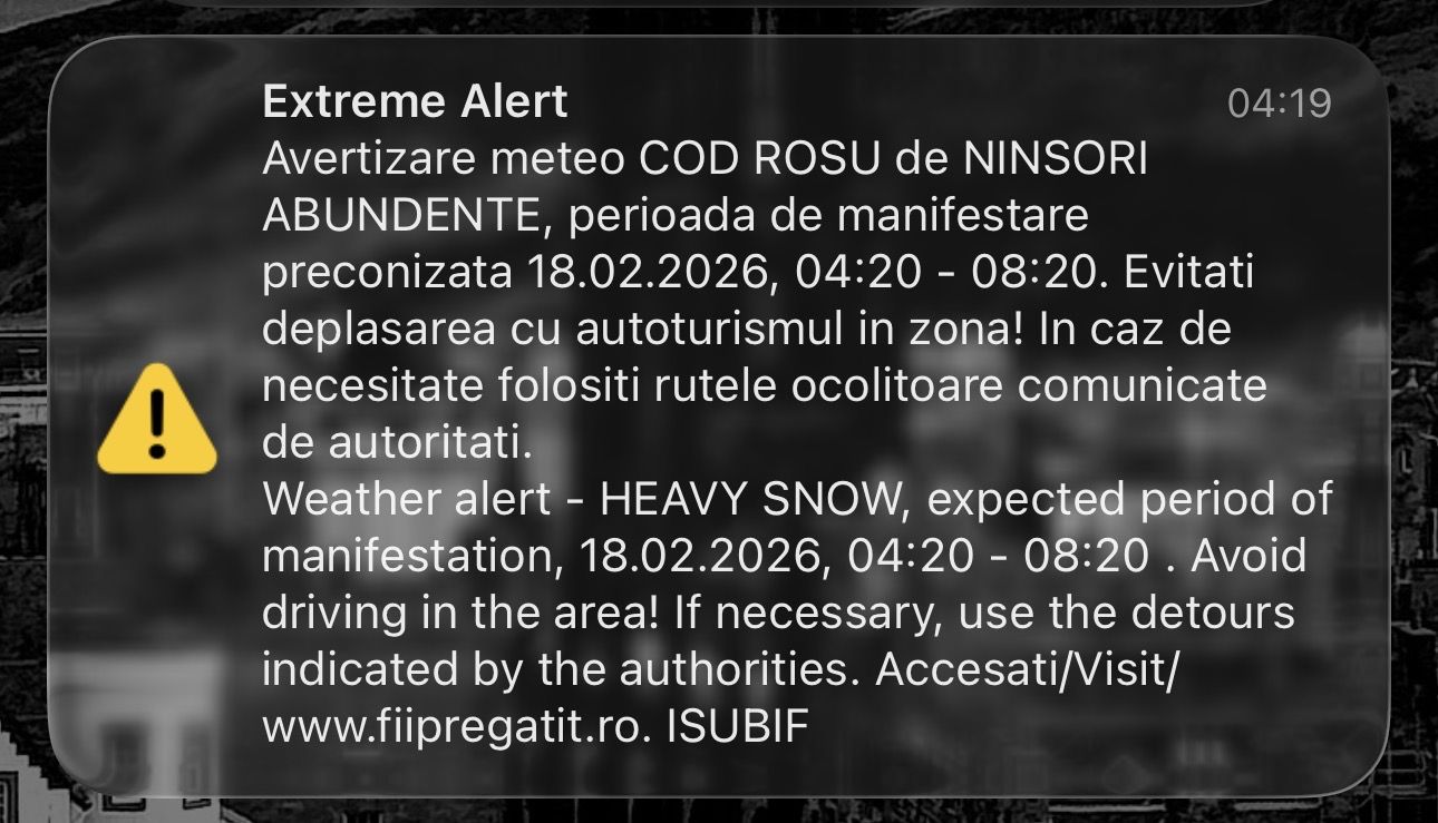 Bucureștenii și locuitorii din Ilfov s-au trezit astăzi, 18 februarie, la 4:19 dimineața, după ce au primit o notificare RO-Alert despre codul roșu de ninsori abundente.