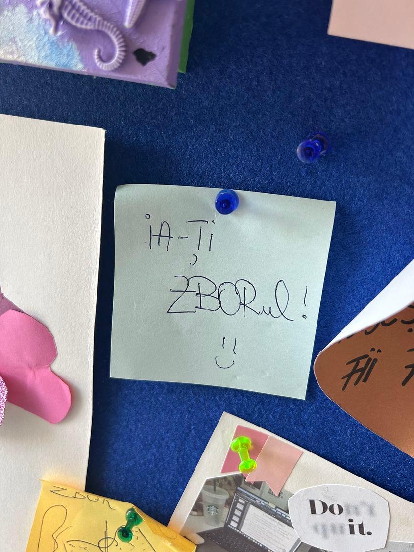 Vizavi de ușa de la intrare îmi atrage atenția un post-it pe care scrie: „Unde visul devine realitate”. Lângă, o fotografie surprinde un grup de tineri care participă la un workshop. Puțin mai jos, alta îi arată jucând cărți. În mijloc, un vision board adună în jurul anului 2025 alte fotografii și mesaje de încurajare. Unul dintre ele te invită să fii mândru de tine.