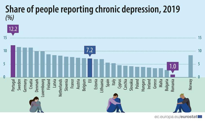 Doar un român din 100 declară deschis că suferă de depresie cronică, cu mult sub media europeană de 7,2%. Cele mai recente date Eurostat, valabile pentru anul 2019, arată România și Bulgaria ca fiind țările cu cei mai optimiști locuitori.