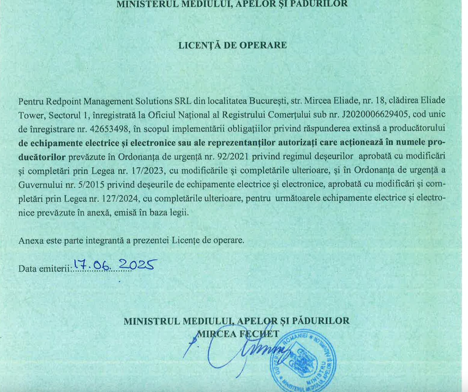 Autorizația firmei Redpoint a fost reînnoită ultima oară în iunie 2025, după cum arată documentul semnat de ministrul Mediului de la acea vreme, Mircea Fechet.