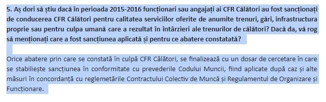 Am mai întrebat oficial dacă, în ultimii doi ani, „funcționari sau angajați ai CFR Călători au fost sancţionaţi de conducerea CFR Călători pentru calitatea serviciilor oferite de anumite trenuri, gări, infrastructura proprie sau pentru culpa umană care a rezultat în întârzieri ale trenurilor de călători”.