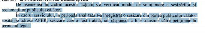 La punctul B.4.3. din raportul pe 2016 se spune că, în perioada analizată, în cadrul Serviciului Supraveghere Drepturi Călători „s-a înregistrat o sesizare din partea publicului călător sosită pe adresa AFER, sesizare care a fost tratată, iar răspunsul a fost transmis către petiționar în termenul legal”.