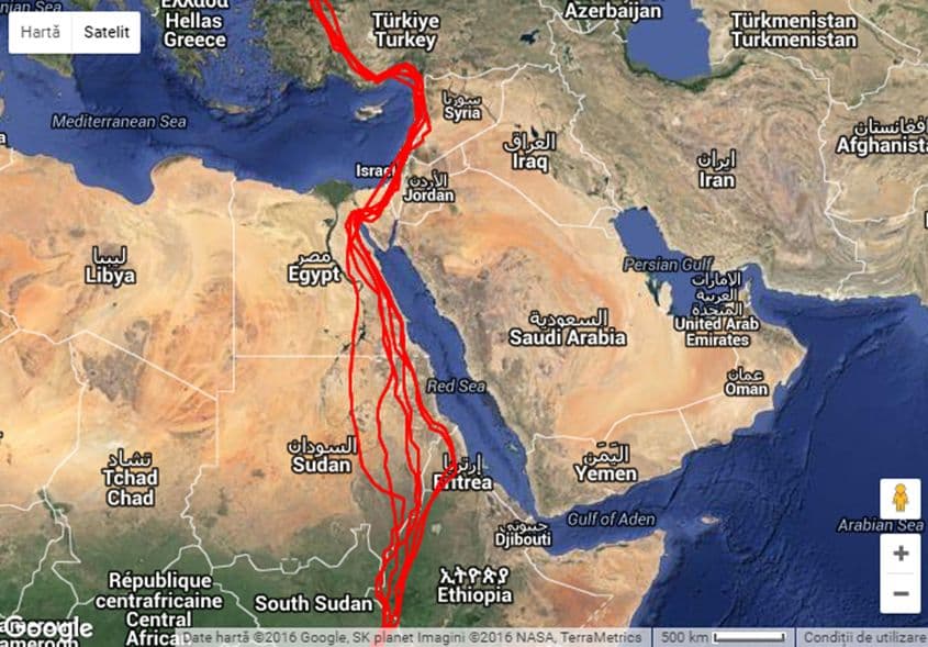 Cuibărește în Piemontul Făgărașului și e al treilea an în care se întoarce din Africa în România. Linia roșie de pe ecran arată că, atunci când pleacă, traversează Carpații, dar nu chiar pieptiș peste Făgăraș, ci puțintel mai la est, pe unde îi e mai ușor.