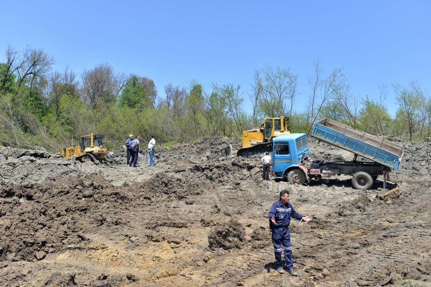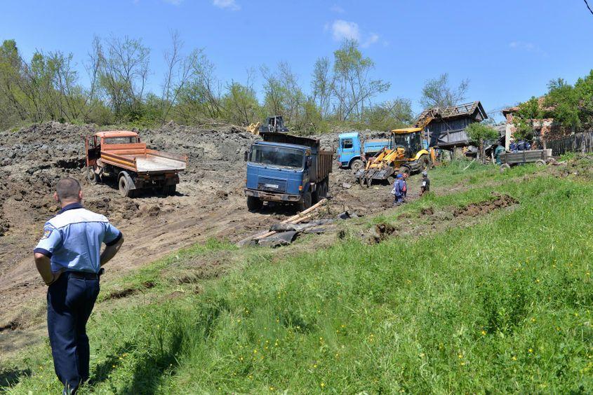 Angajați de la Inspectoratul pentru Situaţii de Urgenţă, lucrători de la Exploatarea Minieră și localnici din Alunu lucrează împreună pentru stabilizarea solului.