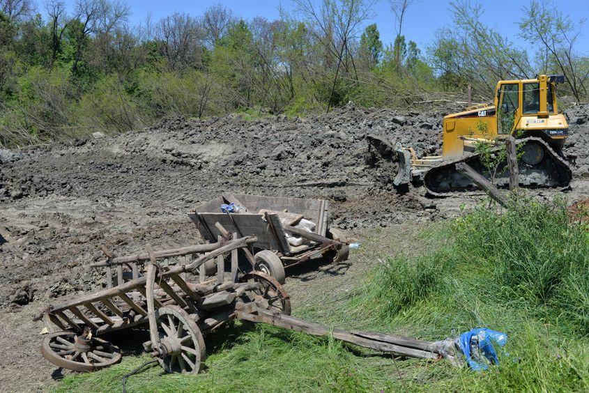 Până acum câteva zile, aici a fost o vale adâncă de 100 de metri. Acum, pământul proaspăt, umflat ca aluatul dospit, este frământat de buldozere.