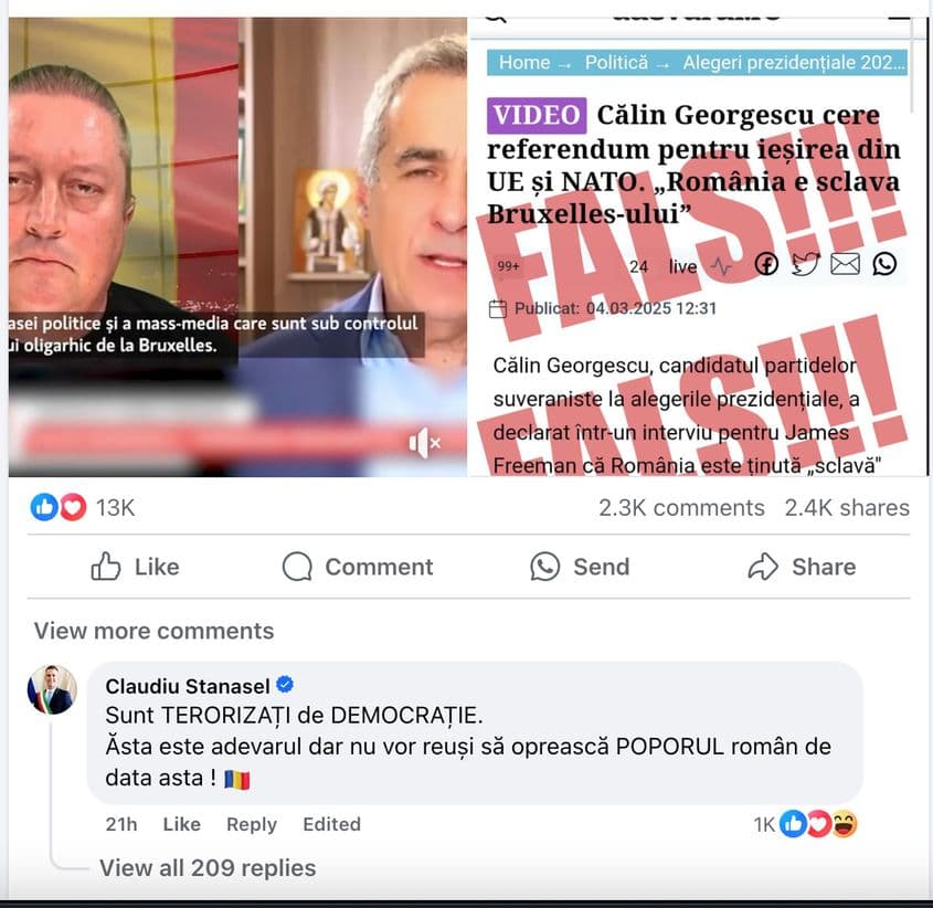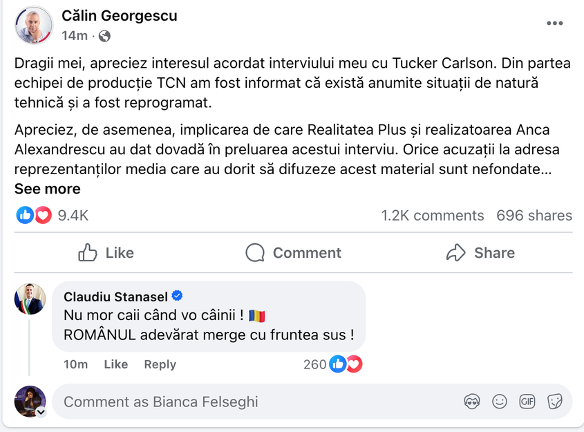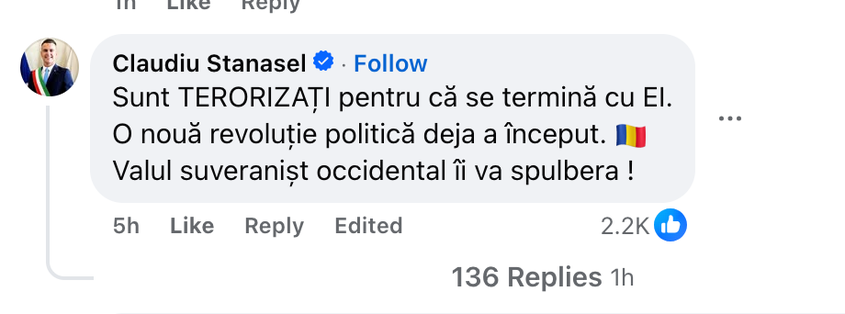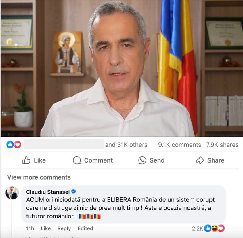 „ACUM ori niciodată pentru a ELIBERA România de un sistem corupt care ne distruge zilnic de prea mult timp! Asta e ocazia noastră a tuturor românilor”, a scris el la una din intervențiile de pe Facebook ale lui Georgescu, mesaj pentru care a primit peste 2.200 de aprecieri.
