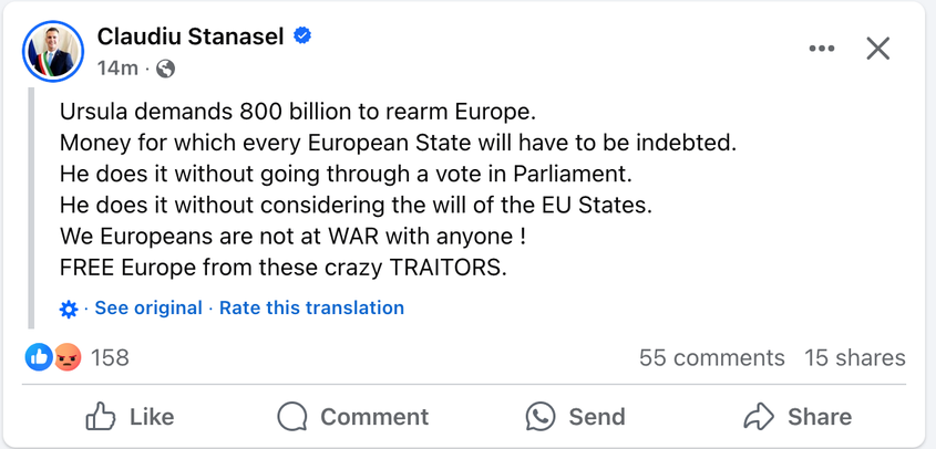 „Ursula demands 800 billion to rearm Europe (...) FREE Europe from these crazy TRAITORS” - „Ursula (von der Leyen, n.red) cere 800 de miliarde ca să reînarmeze Europa (...) Eliberați Europa de acești TRĂDĂTORI nebuni!”, e mesajul postat de el după ce liderii europeni au convenit asupra planului de apărare al UE la începutul lunii martie 2025.