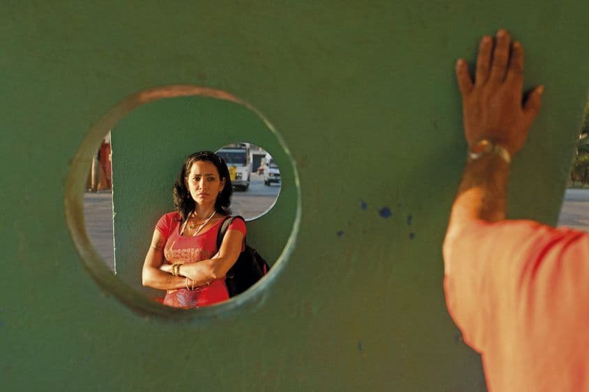 Prin oblonul rotund al zidului de ciment se vede un bărbat povestind ceva fără vlagă, cu un prieten. E atent mai mult la femeie, drept urmare o priveşte fugar cu coada ochiului, de fiecare dată când prietenul lui îşi coboară privirea în ziarul Granma, partitura oficială a simfoniei de partid şi de stat.