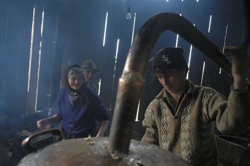 Nu departe, pe firul apei, e o coșmelie de scânduri din care iese fum. Lângă ea, pufăie în doi timpi un tractor. Un tânăr mută borhot de prune din butoiul de pe tractor în cel dinăuntru. În coșmelie, un moș cu baba lui dreg un cazan de țuică. Îl lipesc cu lut, fac foc sub el, își freacă mâinile de frig și se pregătesc de făcut horinca.