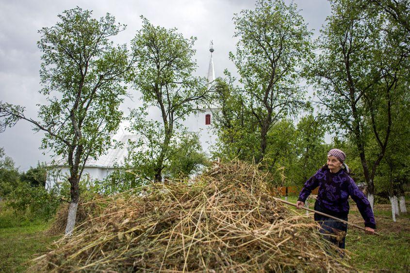 Maria are 80 de ani. O găsim adunând fânul în curtea bisericii ortodoxe din sat, în miezul unei zile caniculare.