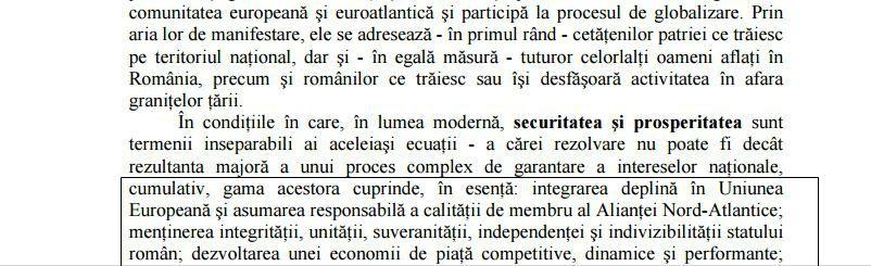 Cumulativ, gama acestora cuprinde, în esență: integrarea deplină în Uniunea Europeană și asumarea responsabilă a calității de membru al Alianței Nord-Atlantice, menținerea integrității, unității, suveranității, independenței și indivizibilității statului român, dezvoltarea unei economii de piață puternice și performante.”