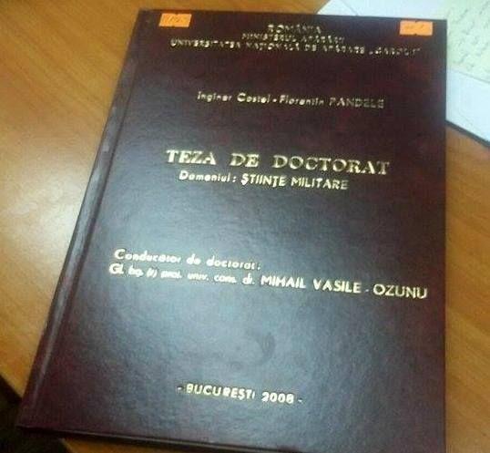Conducător de doctorat i-a fost generalul de brigadă prof. univ. dr. Vasile Mihail Ozunu, actualul director al Colegiului Naţional de Apărare şi fost secretar de stat în Ministerul Apărării în mandatul lui Gabriel Oprea. (Ozunu a făcut parte şi din comisia care, în 2001, i-a acordat lui Oprea titlul de profesor universitar, așa cum PressOne a scris aici.)