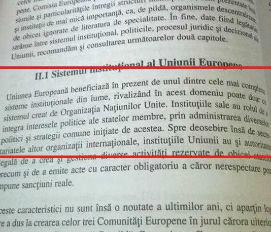 - În primul capitol, de la pagina 56 și până la pagina 76 (20 pagini), Pandele a copiat istoricul instituțiilor UE din Enciclopedia Uniunii Europene.