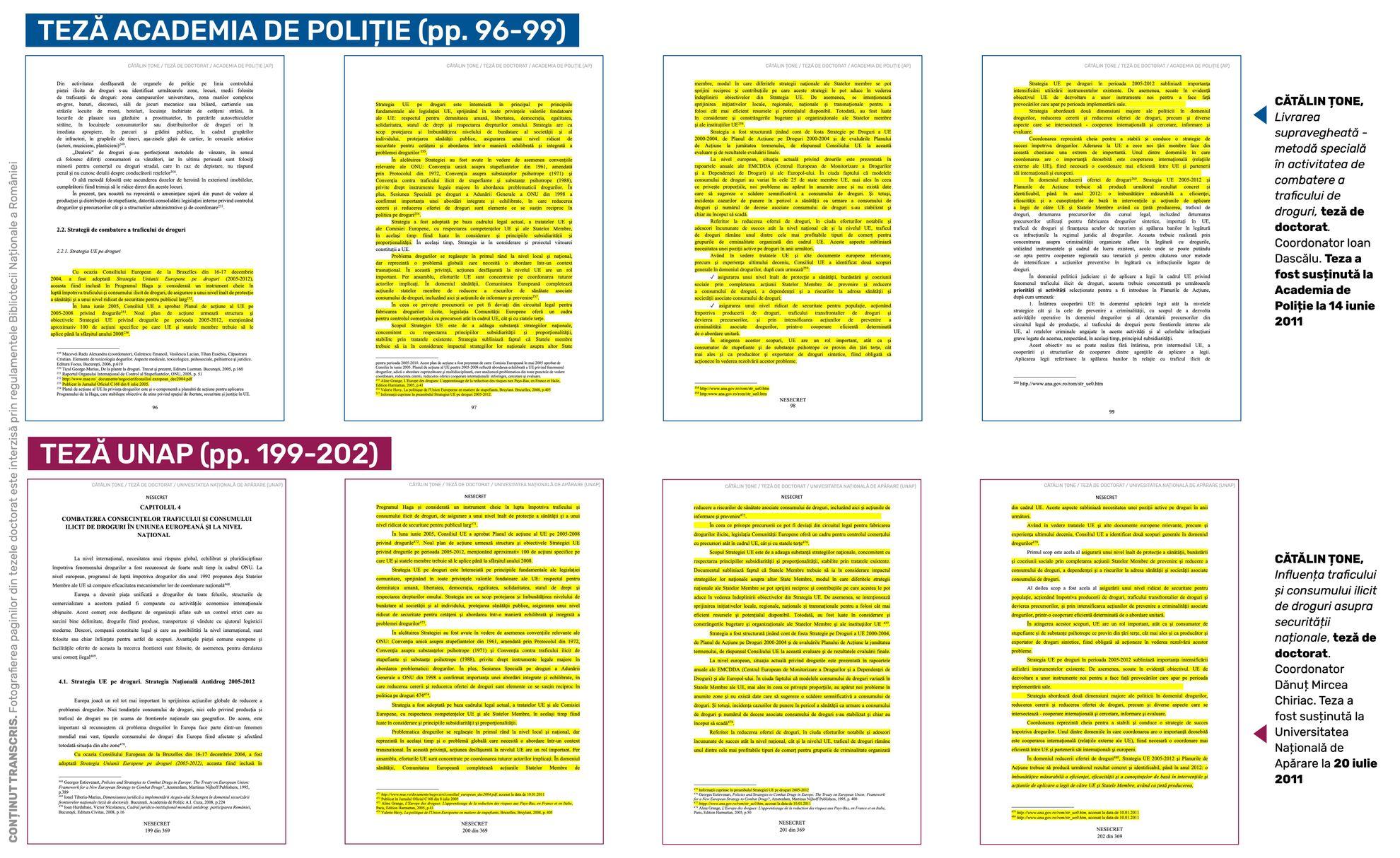 De exemplu, în teza de la UNAP, la pagina 53, este redat un paragraf care conține fraza: „În anul 2004, 50% din confiscările de cocaină...”. În lucrarea de la Academia de Poliție, fraza este reluată identic, cu aceleași date referitoare la capturile de droguri, doar anul a fost modificat: „În anul 2010, 50% din confiscările de cocaină...”. Restul enunțului a rămas neschimbat.