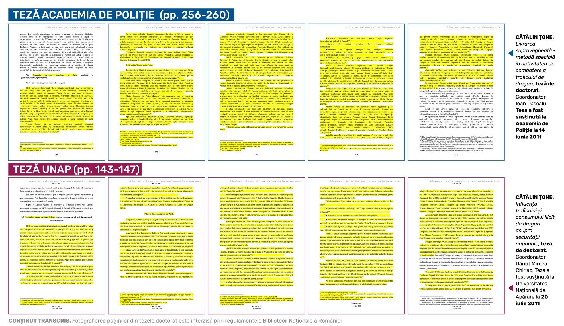 Titlul tezei este Livrarea supravegheată - metodă specială în activitatea de combatere a traficului de droguri, lucrarea fiind coordonată de prof. univ. dr. Ioan Dascălu.